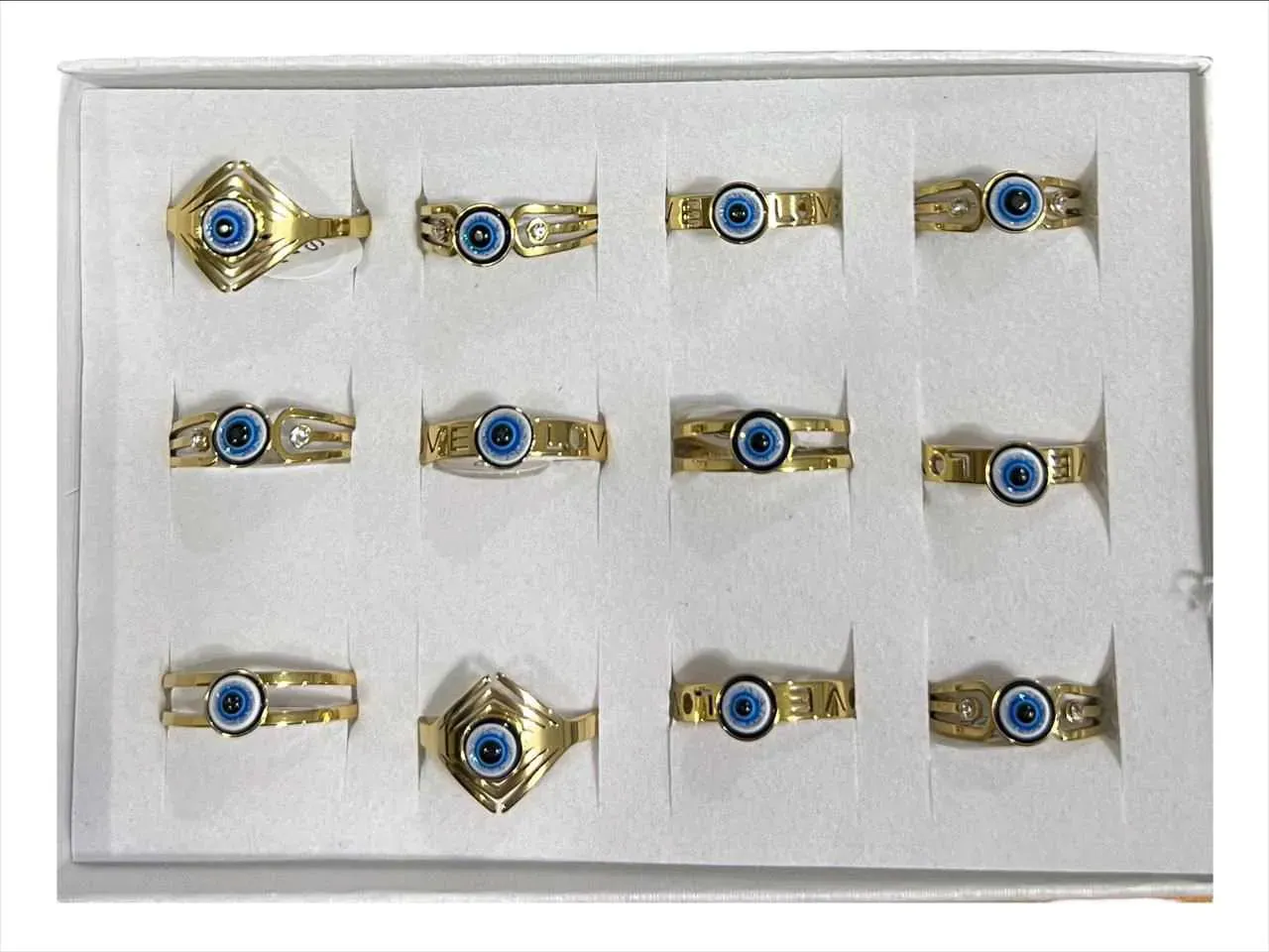 Docena (12 unidades) de anilllos dorados inoxidables con ojo turco azul de cristal ( diferentes diseños/ medidas surtidas ) en 12.40 USD